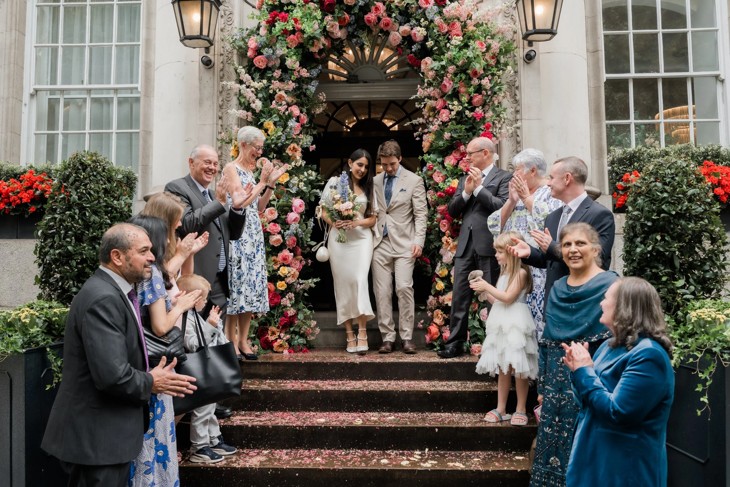 Afterwards, the streets around Chelsea provided the backdrop for Shameelah & Alex’s couple session and the walk to the wedding breakfast. There’s something about central London weddings that brings a slightly different rhythm: taxis pulling up, passers-by offering their congratulations, and the sense of the day sitting comfortably within the movement of the city itself. It allows for photographs and video that feel grounded in place without needing to step away from what’s already happening.